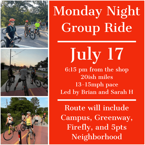 Sarah H and Brian are leading a ride on July 17 to offer a "quasi" social ride - Meaning we will ride through campus pick up the Greenway at Willow St and ride to Sandy Creek Nature Center, back towards the east side via MLK and Firefly. From the current end of the Firefly we will make our way towards Winterville, turning right on Moss road and heading back to towards the Firefly off Winterville Rd. We will cross Lexington and jump back on the Greenway to make our way back through campus and 5pts. You can find the cue sheet here: Monday Social Ride